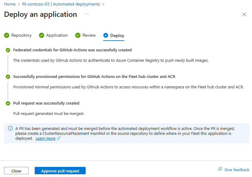 There's a known issue with the naming of the generated pull request where it says it's deploying to AKS. Despite this incorrect name, the resulting workflow does stage your workload on the Fleet Manager hub cluster in the namespace you selected.