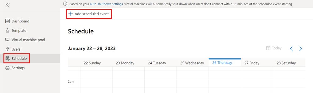On the Schedule page for the lab, select Add scheduled event on the toolbar.