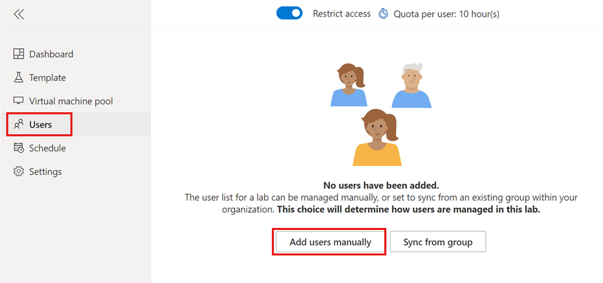 On the Add users page, enter the lab user email addresses on separate lines or on a single line separated by semicolons.