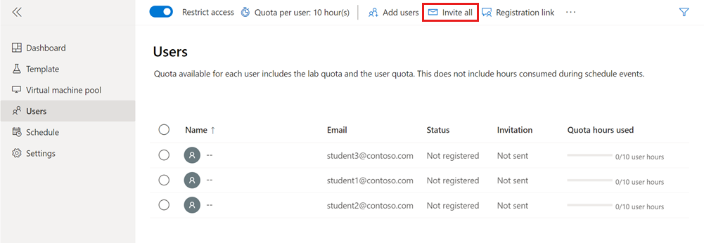 After you add users to the lab, they can register for the lab by using a registration link for the lab. You can either manually provide users with the link or Azure Lab Services can send invitation emails.