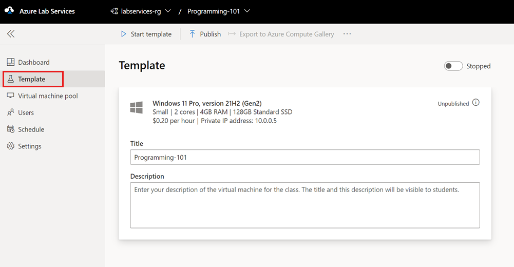 The lab template serves as the basis for the lab VMs. To make sure that lab users have the right configuration and software components, you can customize the lab template.