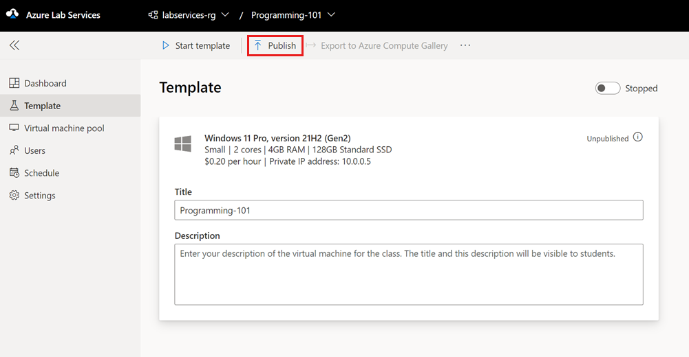 You use the Azure Lab Services website to create a customizable lab (lab template) in the lab plan. In Azure Lab Services, a lab contains the configuration and settings for creating lab VMs. All lab VMs in a lab are the same. In the next section, you customize the lab template for the classroom training.