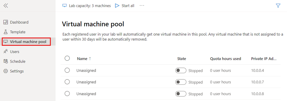 The lab VMs are currently stopped and unassigned, which means that they aren't assigned to specific lab users.