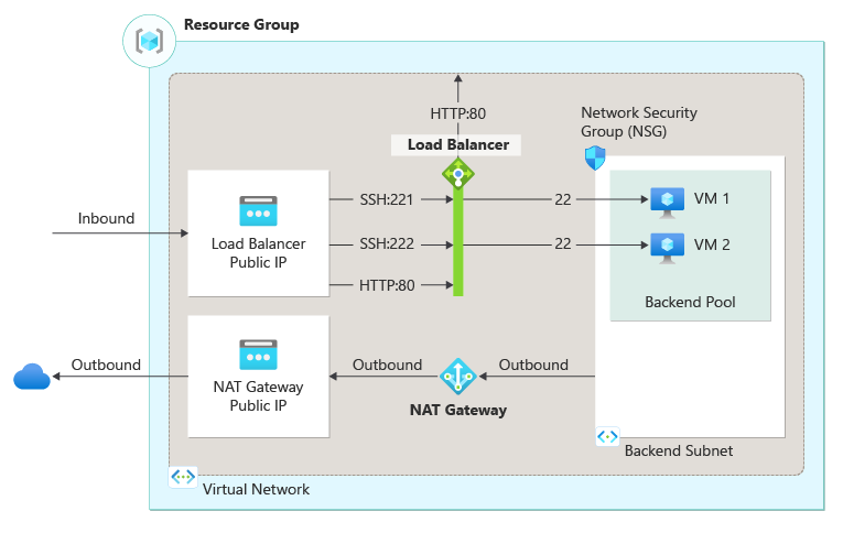 For more information about outbound connections and Azure Virtual Network NAT, see Using Source Network Address Translation (SNAT) for outbound connections and What is Virtual Network NAT?.