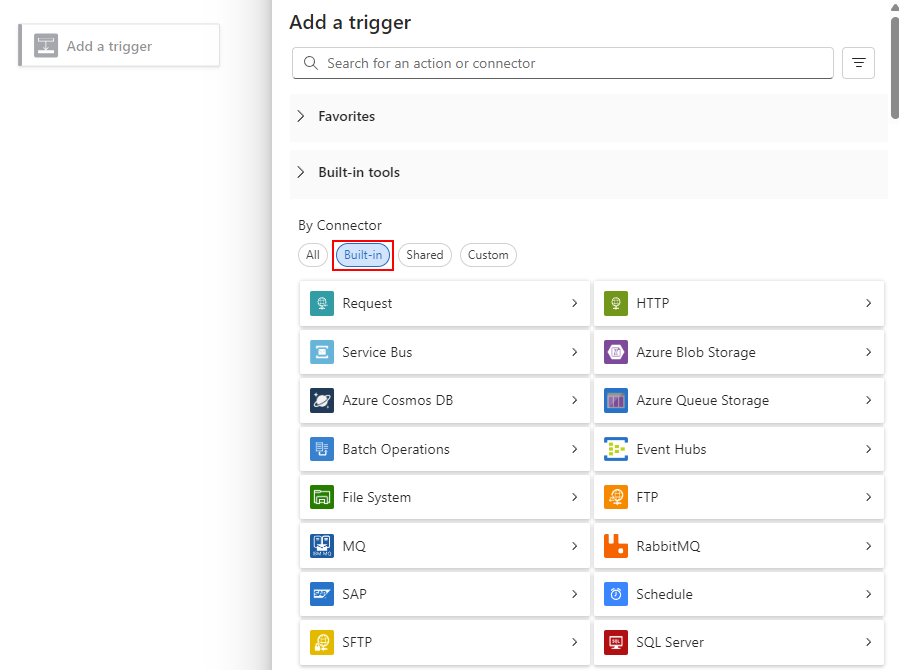 The following Standard workflow example shows the Built-in operation collections and connectors when you add a trigger: