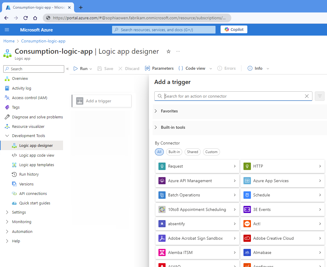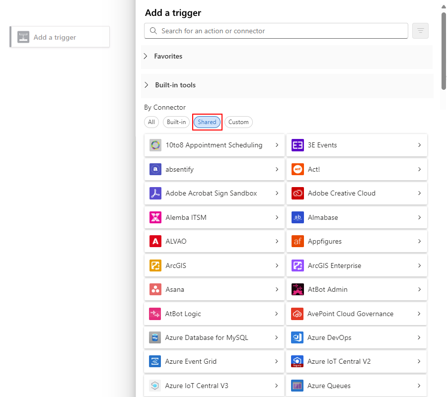 - Shared: Connectors with triggers that are Microsoft-managed, hosted, and run in multitenant Azure. This group combines the legacy Standard and Enterprise groups in earlier designer versions.