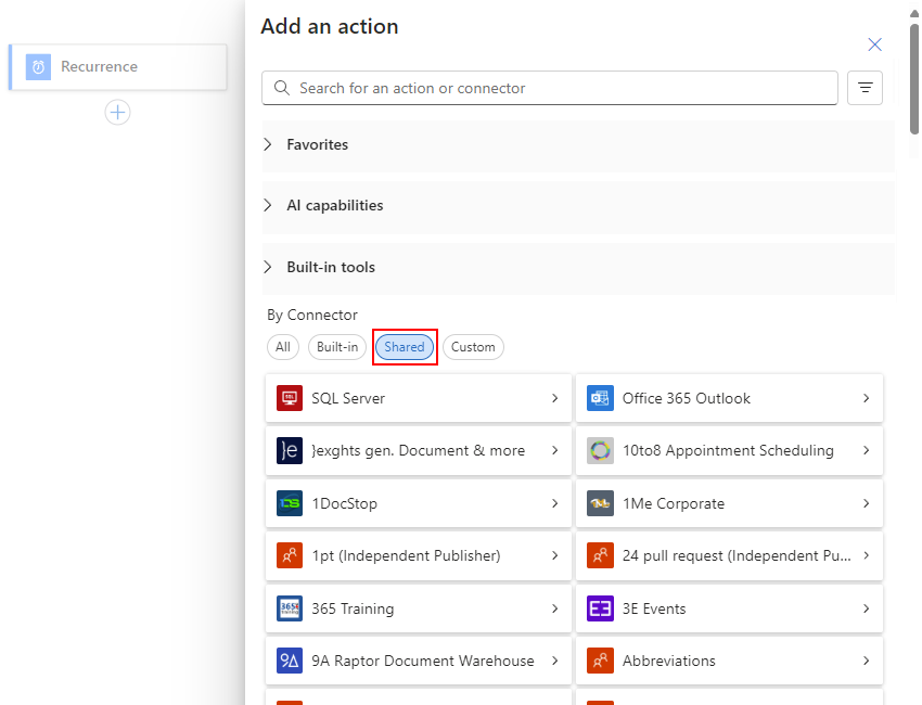 The following example shows the workflow designer with the opened Add an action pane and the selected Shared option. The list shows the available connectors, which appear in a specific order.