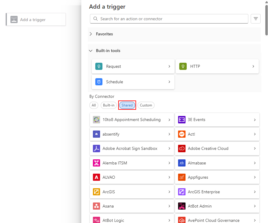 The following example shows the blank workflow designer with the opened Add a trigger pane open and the selected Shared option. The list shows the available connectors, which appear in a specific order.