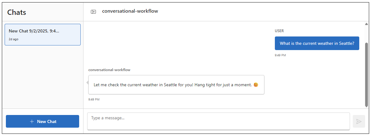 The agent accepts system instructions and human-provided prompts or inputs through the integrated chat interface, for example, What is the weather in Seattle?