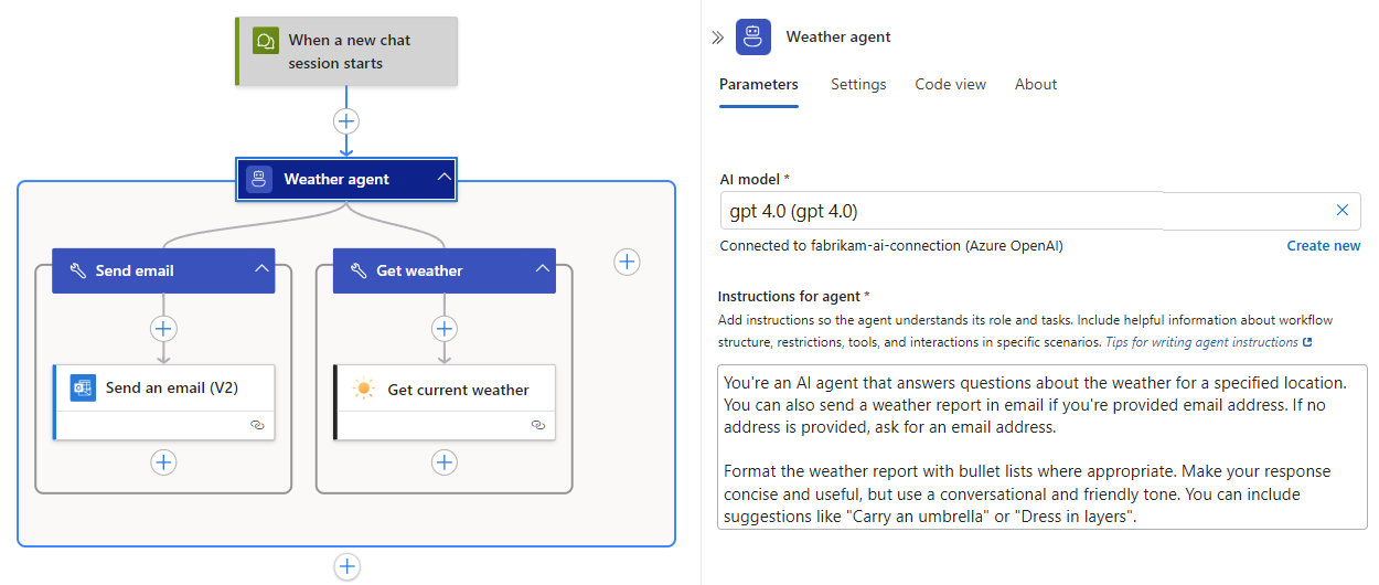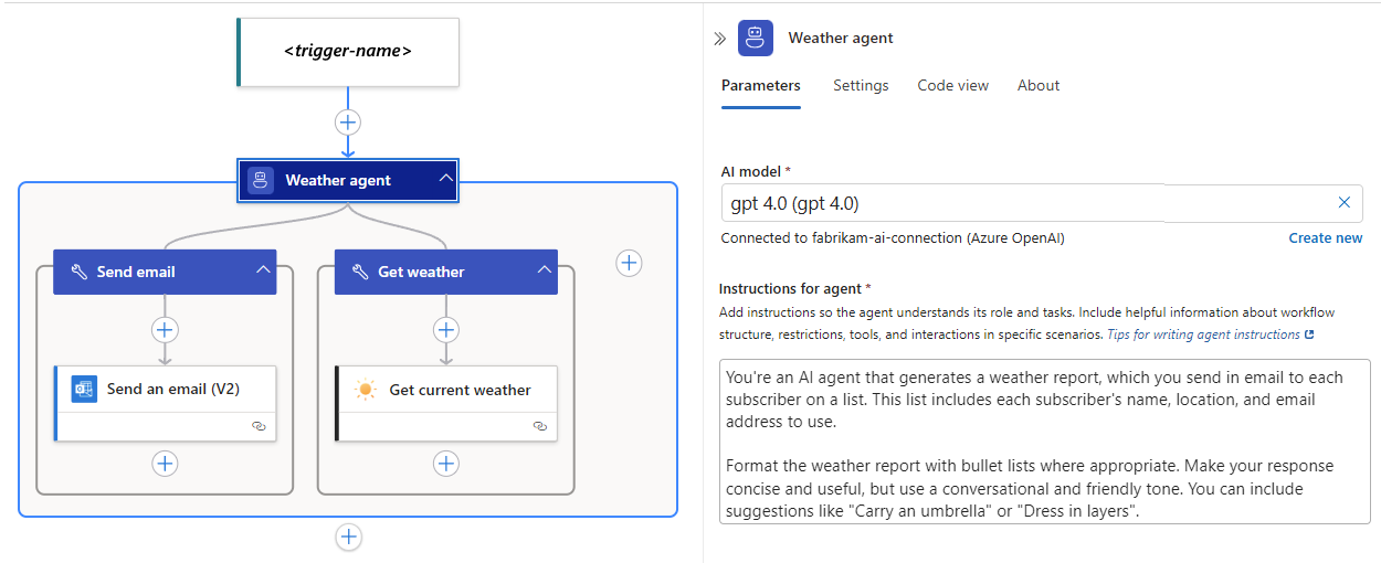 The following diagram shows a weather agent that can get the weather forecast and send that forecast in email: