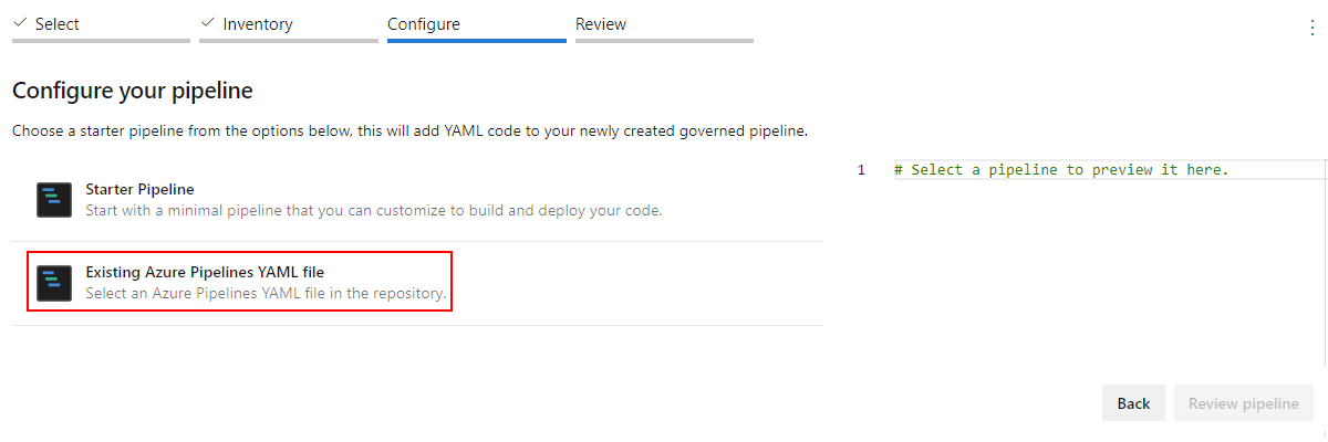 On the Configure your pipeline pane, select Existing Azure Pipelines YAML file.