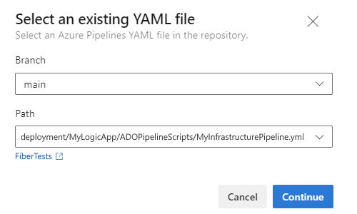 On the Select an existing YAML file pane, follow these steps to select your Infrastructure-pipeline.yml file: