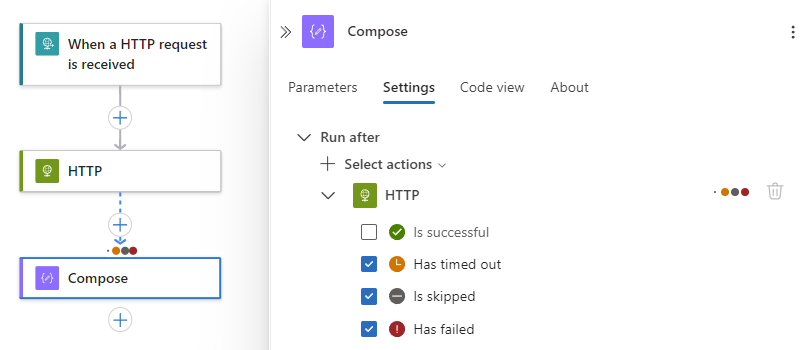 In the following example, the scoped actions run after the HTTP action completes with any of the selected statuses: