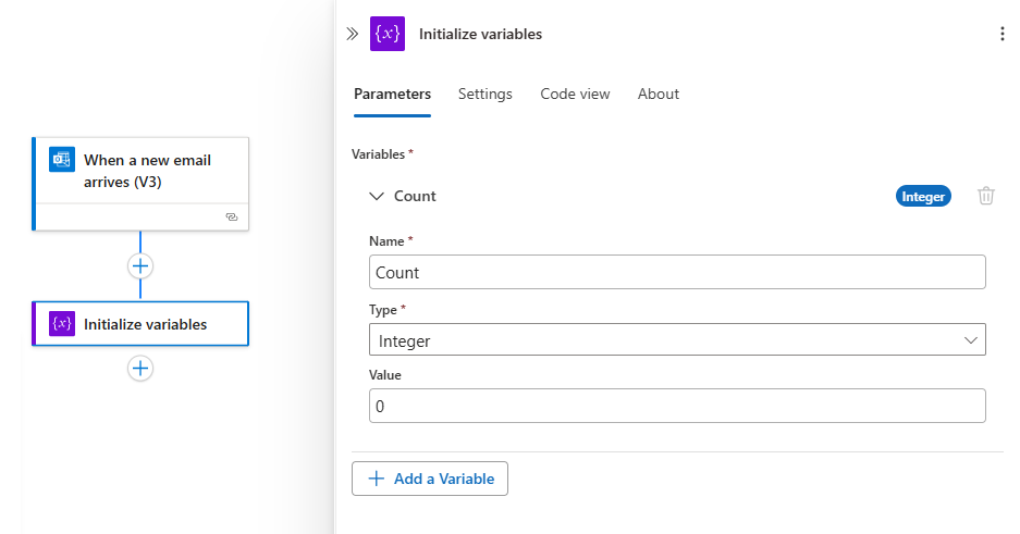 3. Add the Initialize variables action to create an integer variable named Count that has a start value set to 0.