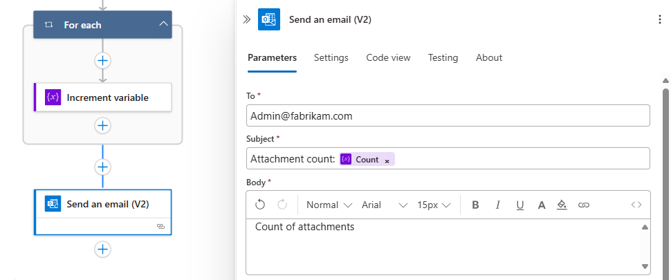 9. Under the loop, add any action that sends you the number of attachments. In your action, include the value from the Count variable, for example: