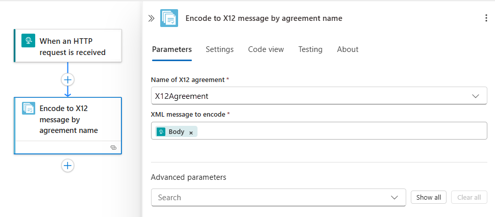 Parameter Required Description Name of X12 agreement Yes The X12 agreement to use. XML message to encode Yes The XML message to encode. Advanced parameters No More parameters that you can select: