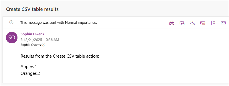 To create a comma-separated value (CSV) table that has the properties and values from JavaScript Object Notation (JSON) objects in an array, use the action named Create CSV table. You can then use the resulting table in actions that follow the Create CSV table action.