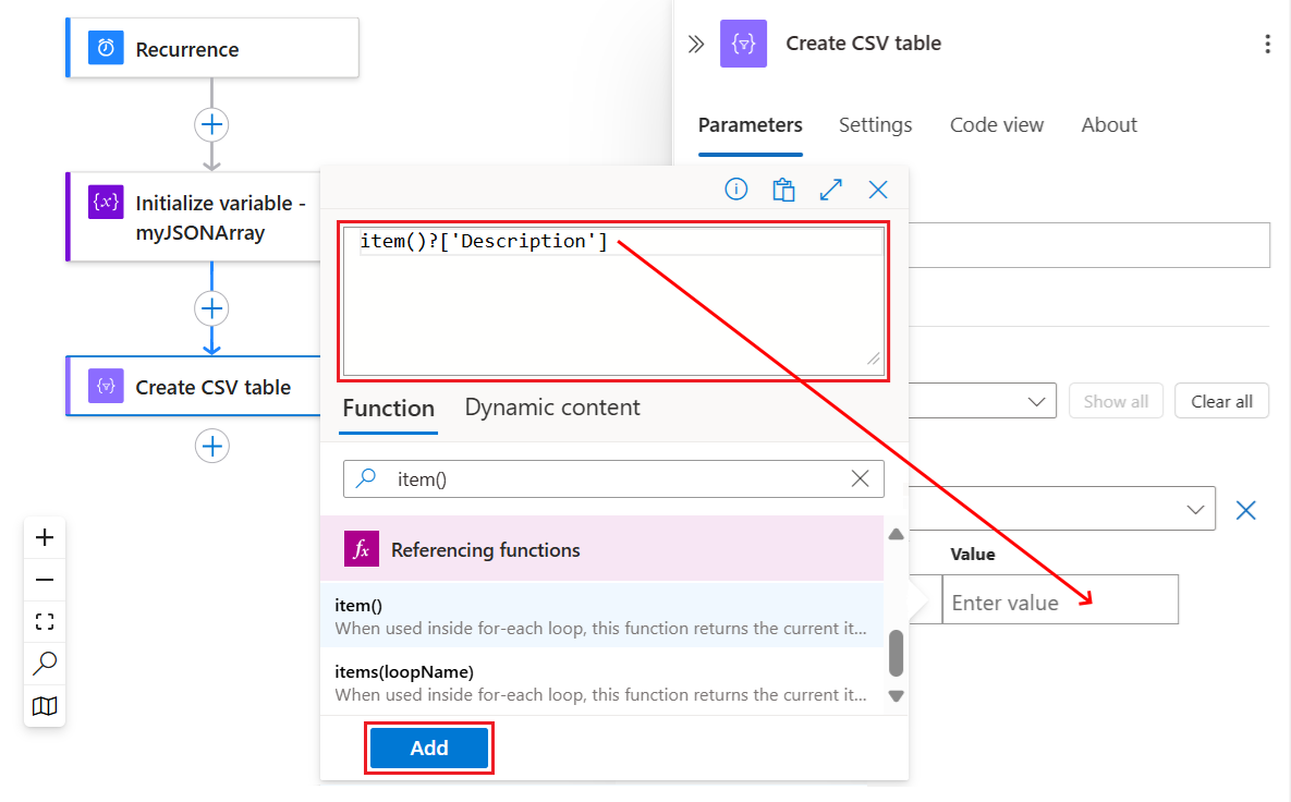 - Value:[ { "Description": "Apples", "Product_ID": 1 }, { "Description": "Oranges", "Product_ID": 2 }]Follow these general steps to add the Data Operations action named Create CSV table.