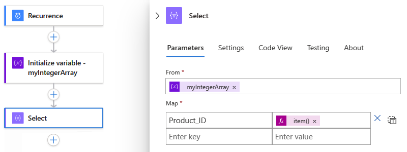 To try the Select action, follow these steps by using the workflow designer. Or, if you prefer working in the code view editor, you can copy the example Select and Initialize variable action definitions from this guide into your own logic app's underlying workflow definition: Data operation code examples - Select. For more information about this action in your underlying workflow definition, see Select action.