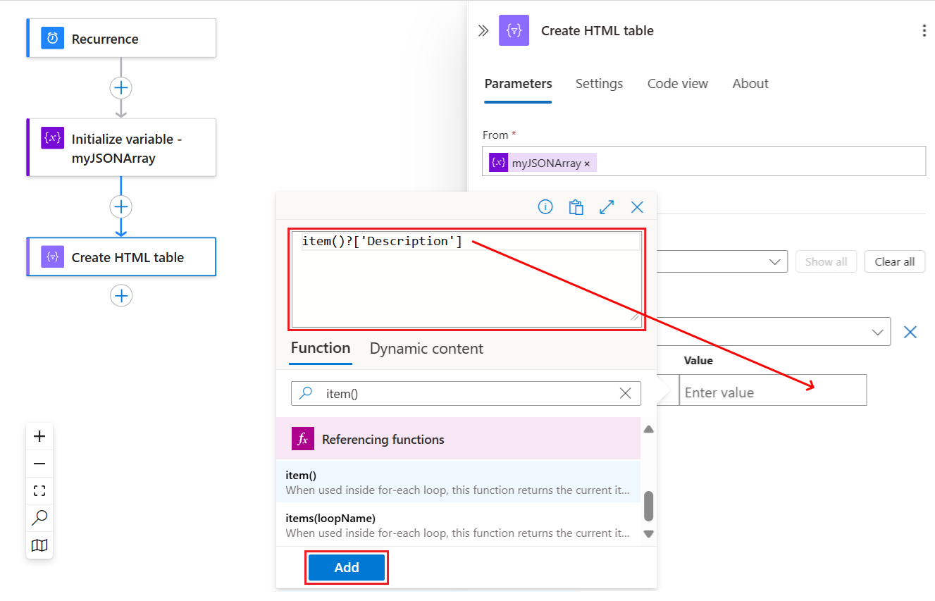 On the designer, select the Create HTML table action, if not already selected. In the From box, enter the array or expression to use for creating the table.