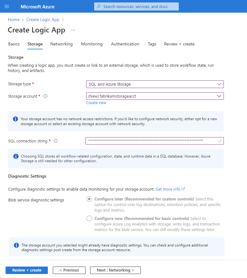 Note: Make sure that you enter a correct connection string because Azure portal won't validate this string for you.The following example shows the Create Logic App page with the Storage tab: