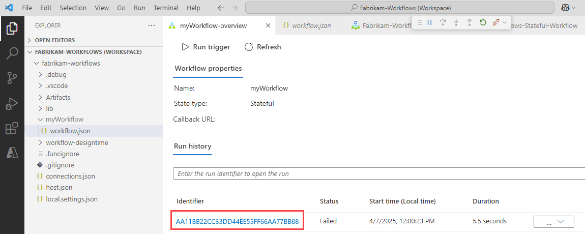 On the overview page, under Run history, select the workflow run to use for creating a unit test.