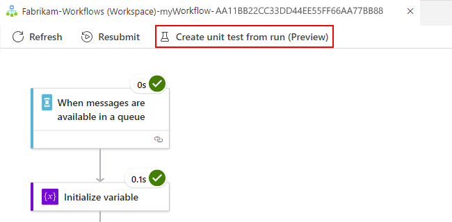 This guide shows how to create a unit test definition from a workflow run. This definition mocks the external calls from each workflow operation without changing the workflow logic. When you create a unit test from a workflow run, you get a unit test project that includes two folders: