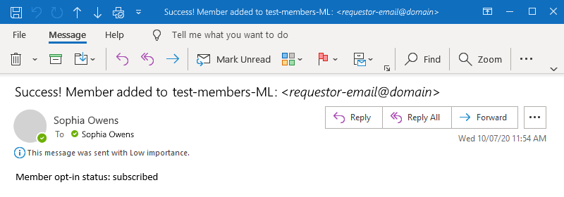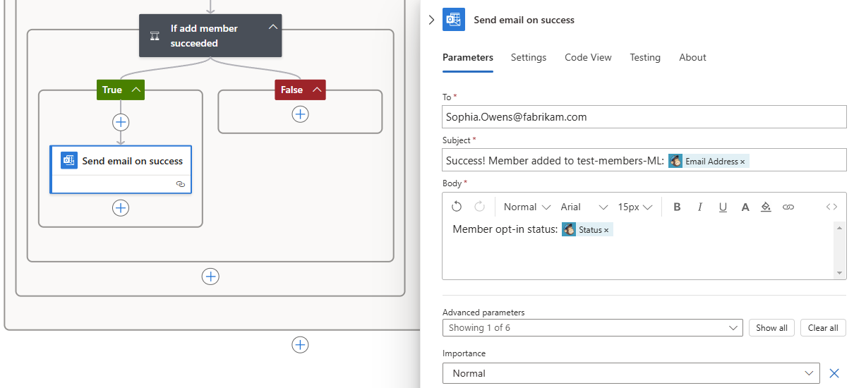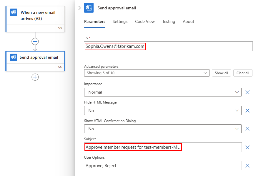 This example uses Approve member request for test-members-ML.For more information about these properties, see the Office 365 Outlook connector reference or the Outlook.com connector reference.