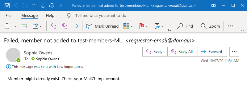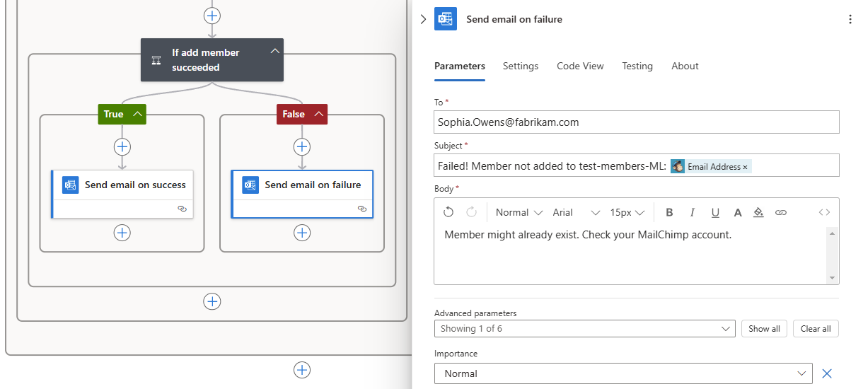 The following steps add an action to send failure email when the workflow fails in adding the member to your mailing list.