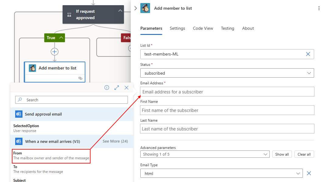 From the dynamic content list, in the When a new email arrives section, select From, which is a trigger output.For more information about the Add member to list action properties, see the MailChimp connector reference.