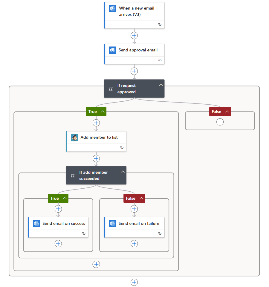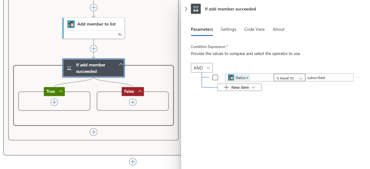 The following steps add a condition to check whether the new member successfully joined your mailing list. Your workflow can then notify you whether this operation succeeded or failed.