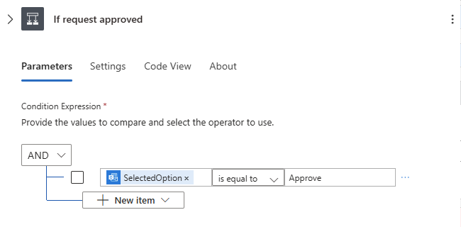 On the Parameters tab, in the first row under the AND list, select inside the left box, and then select the dynamic content list (lightning icon). From this list, in the Send approval email section, select the SelectedOption output.