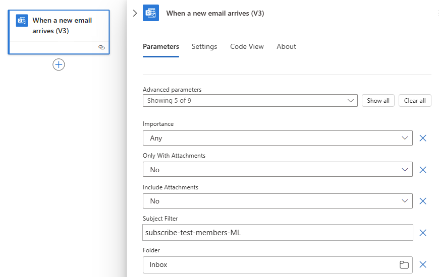 Parameter Value Description Importance Any Specifies the importance level of the email that you want. Folder Inbox The email folder to check. Subject Filter subscribe-test-members-ML Specifies the text to find in the email subject and filters emails based on the subject line. Note