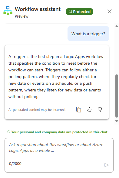 In the chat box, enter your question about the current workflow or about Azure Logic Apps.