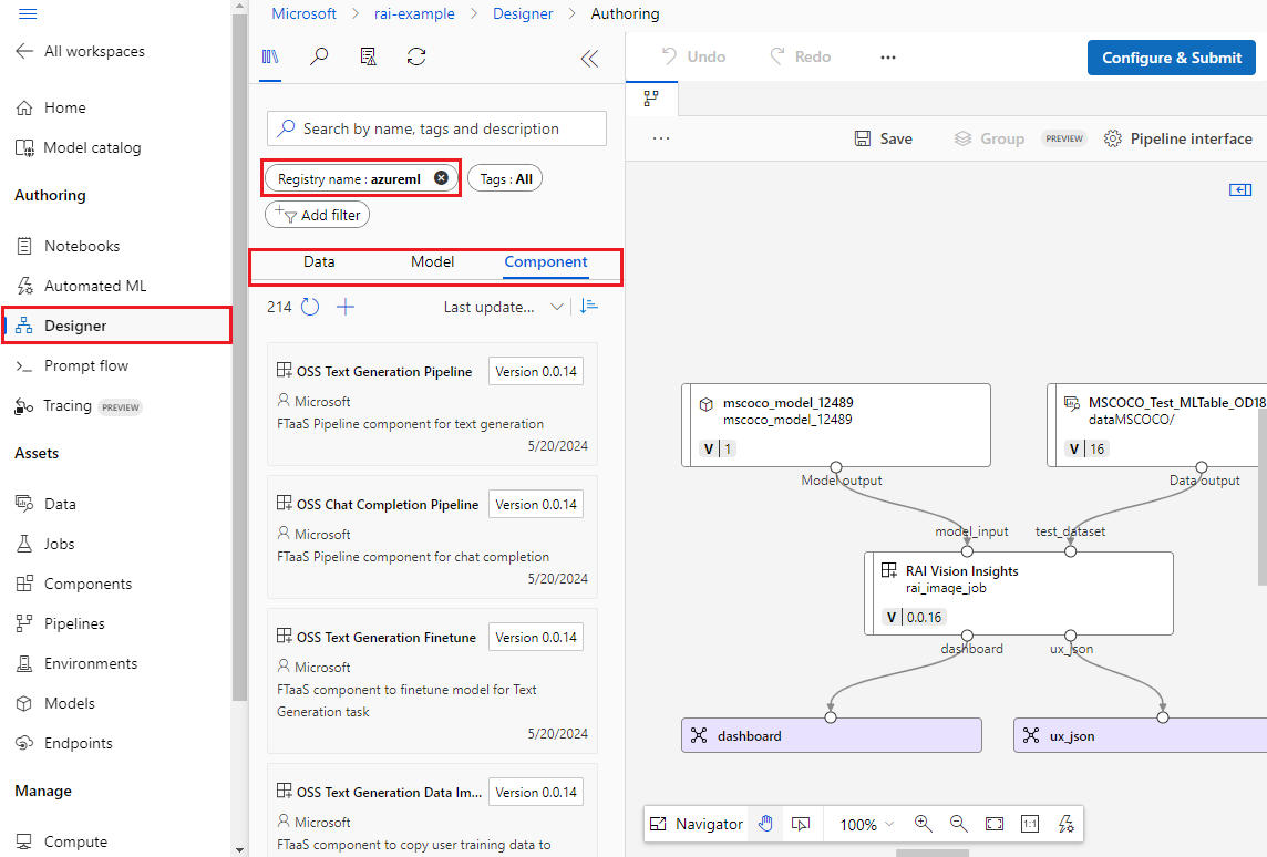 The Data, Model, and Component tabs on the left side of Designer show assets in your workspace and in all Azure Machine Learning registries that you can access.