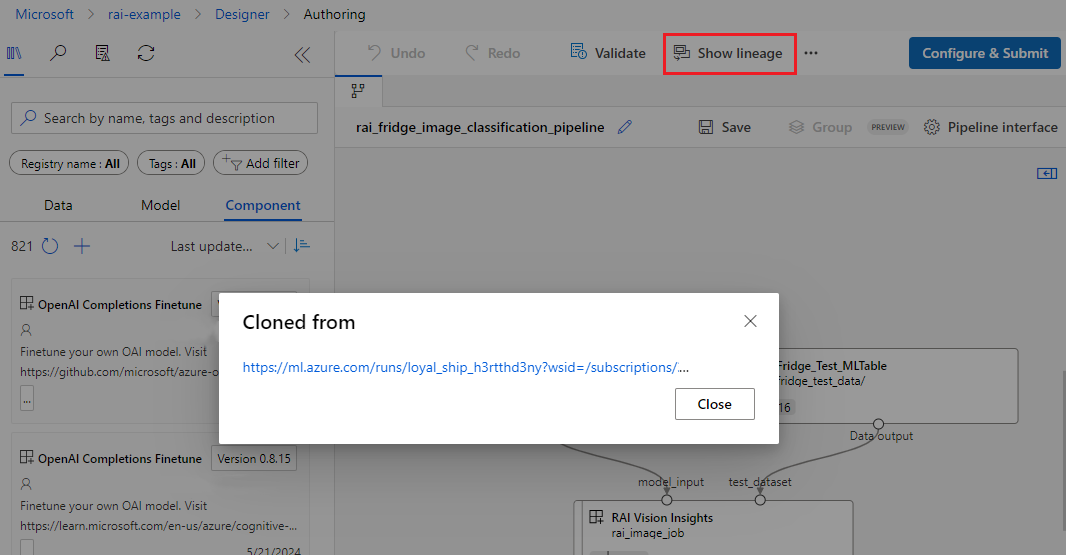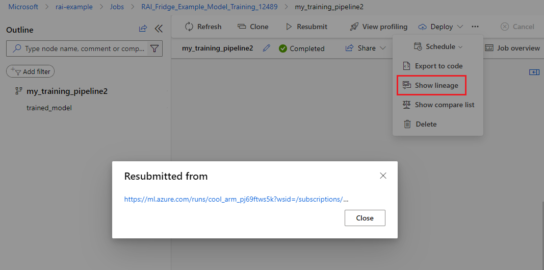 After cloning, you can find which pipeline job the new pipeline was cloned from by selecting Show lineage.