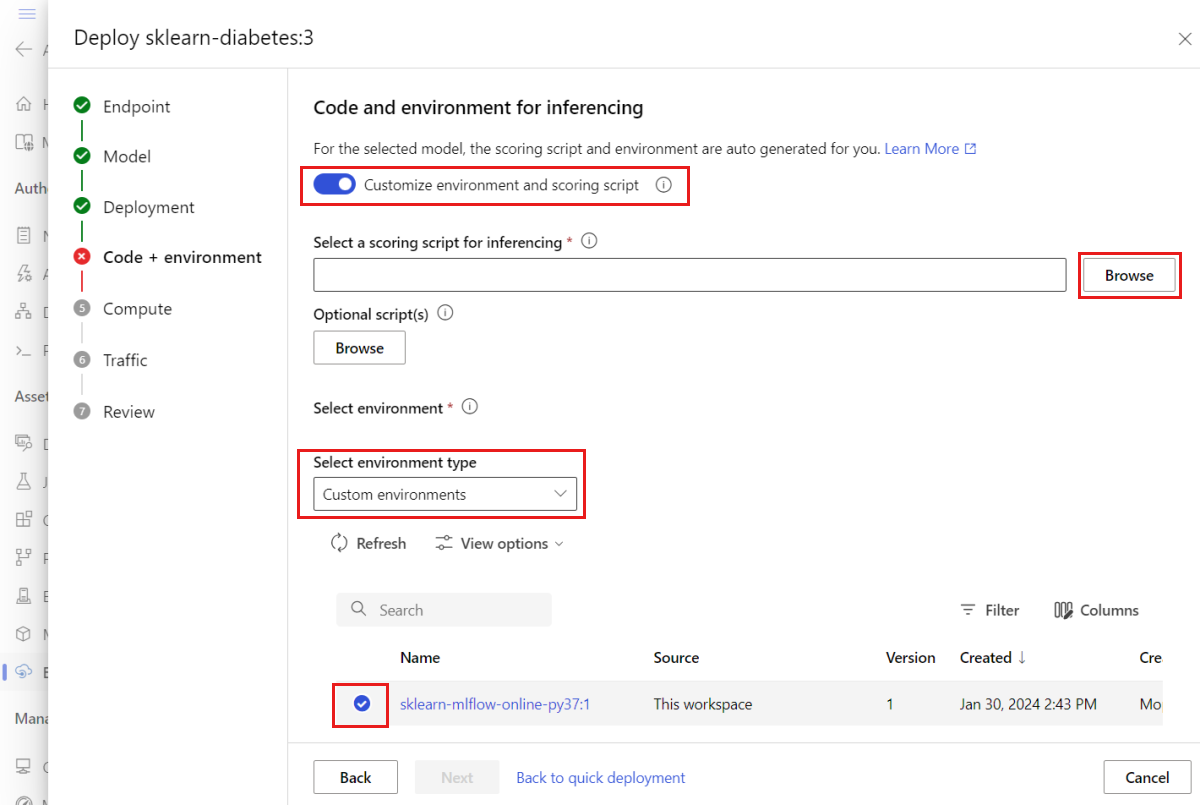 If you specify a scoring script for an MLflow model deployment, you also have to specify the environment that the deployment runs in.