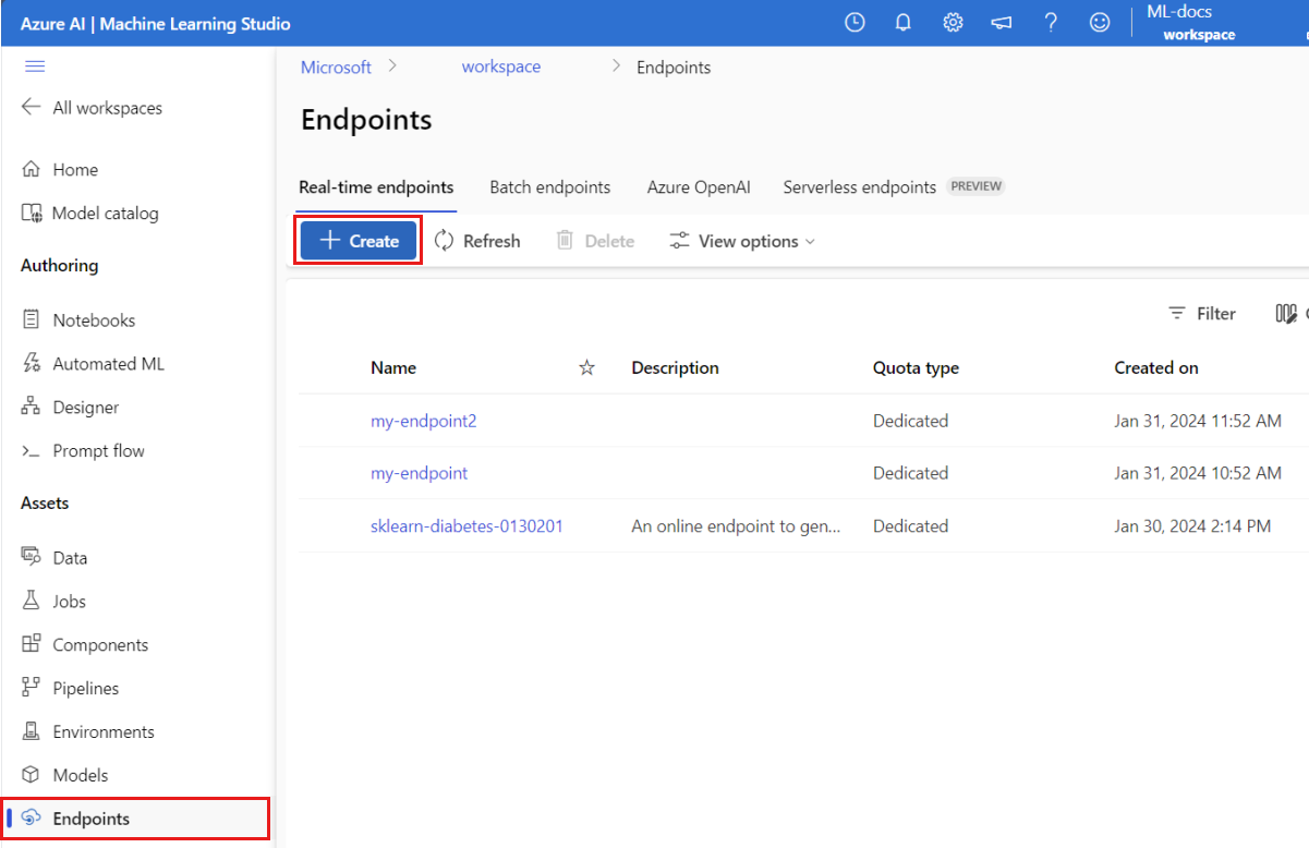 $schema: https://azuremlschemas.azureedge.net/latest/managedOnlineEndpoint.schema.json name: my-endpoint auth_mode: keyCreate the endpoint: