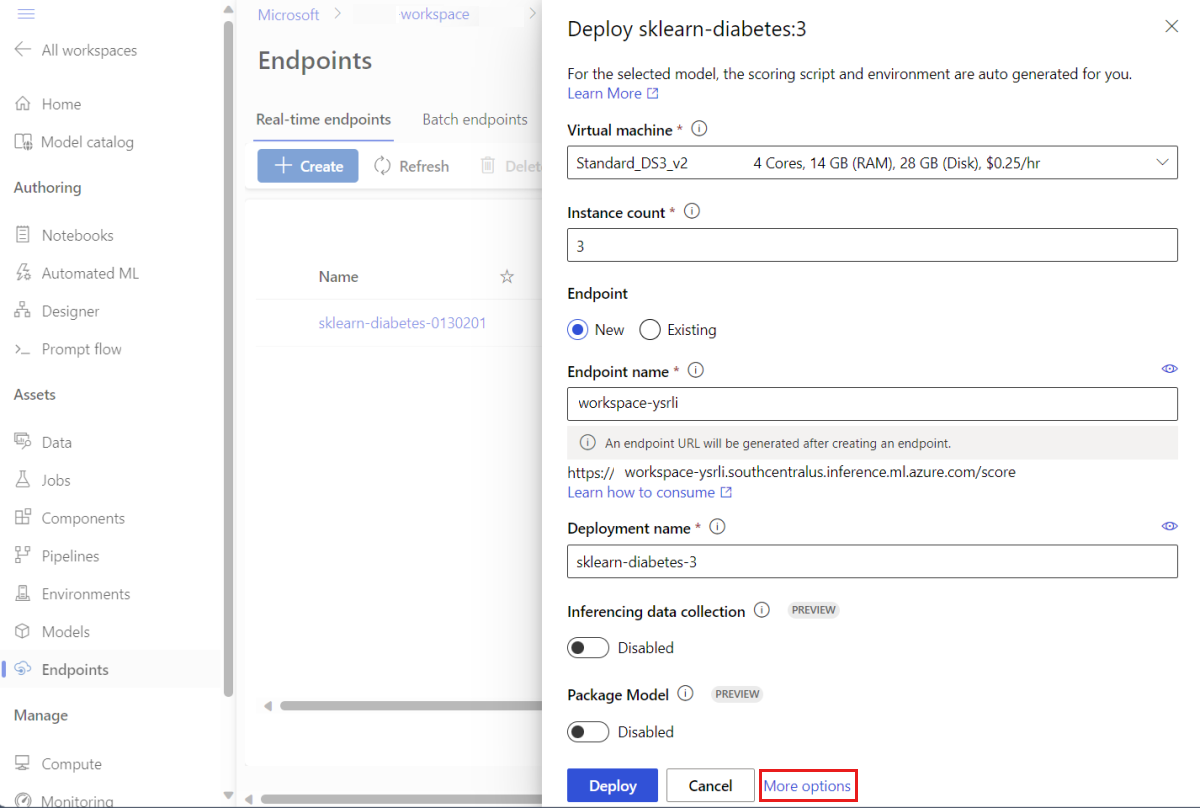 $schema: https://azuremlschemas.azureedge.net/latest/managedOnlineDeployment.schema.json name: sklearn-deployment endpoint_name: my-endpoint model: name: mir-sample-sklearn-ncd-model version: 2 path: sklearn-diabetes/model type: mlflow_model instance_type: Standard_DS3_v2 instance_count: 1Note