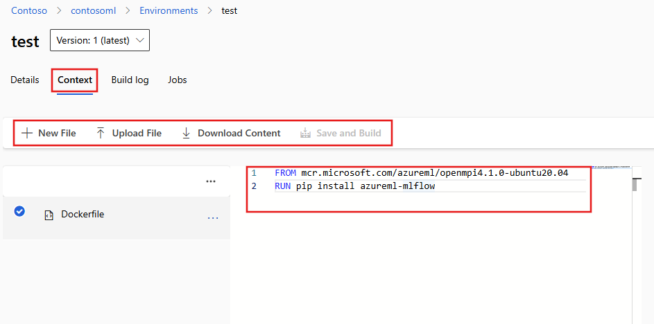 3. Select the Context tab to upload additional files or edit the existing Dockerfile. Use Save and Build to save any changes and rebuild the context.