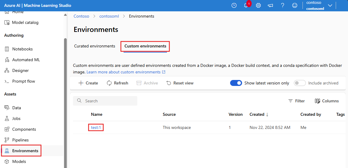 1. Once an environment has been created, view its details by selecting the Name from the Custom environments tab.