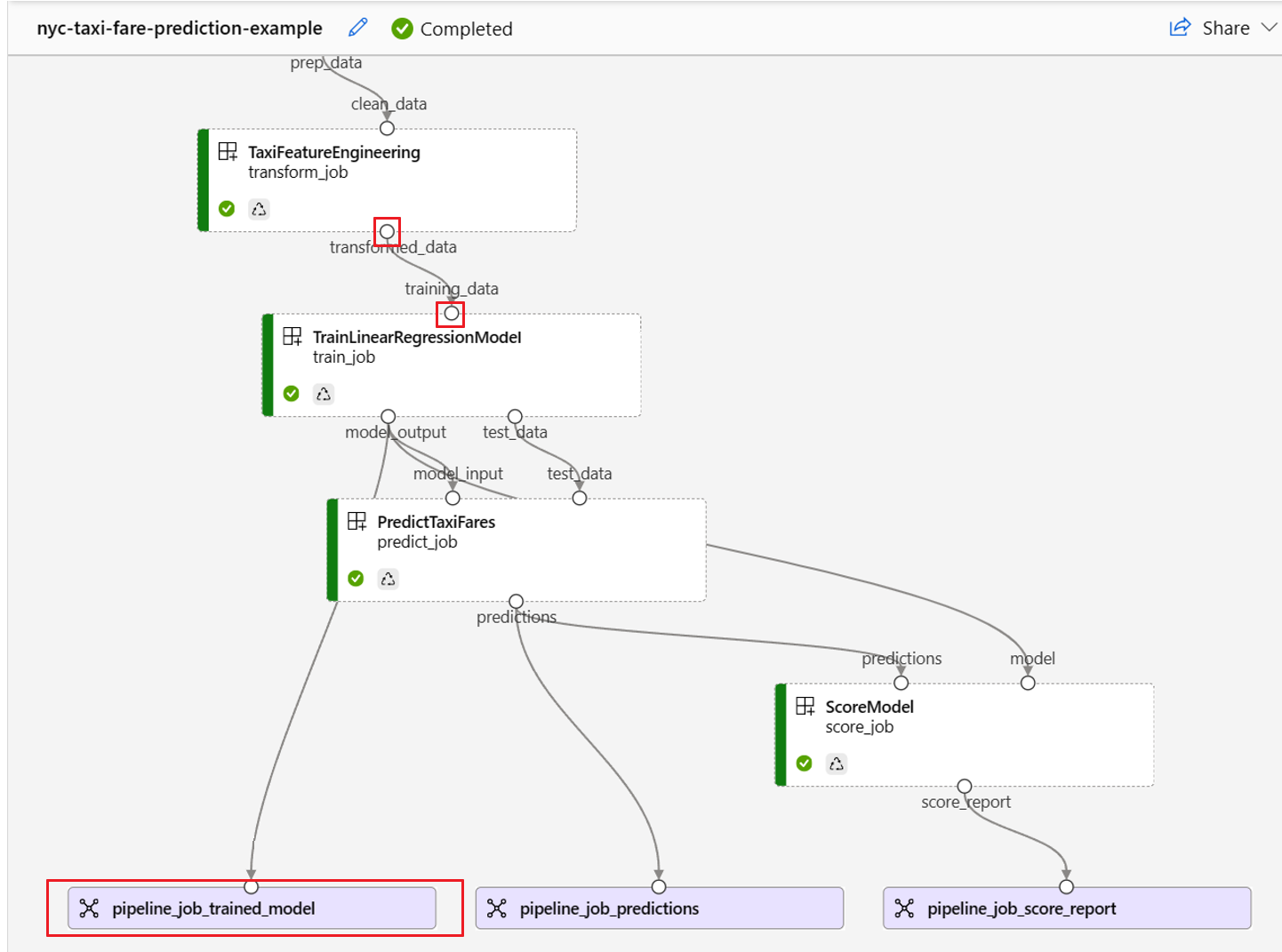 The following screenshot from the NYC Taxi Data Regression pipeline graph shows many component and pipeline inputs and outputs.