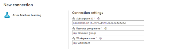 In the Connection settings section of the creation wizard, specify the values of the subscription ID, Resource group name, and Workspace name, where your endpoint is deployed.