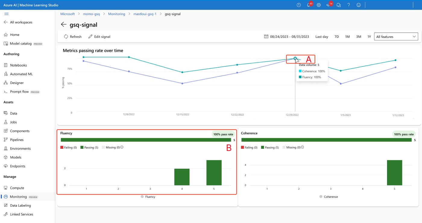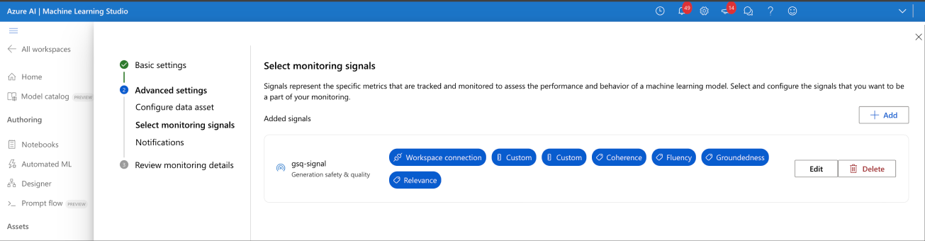 - Integration with Azure Machine Learning prompt flow evaluation metrics, analysis of collected production data to provide timely alerts, and visualization of the metrics over time.