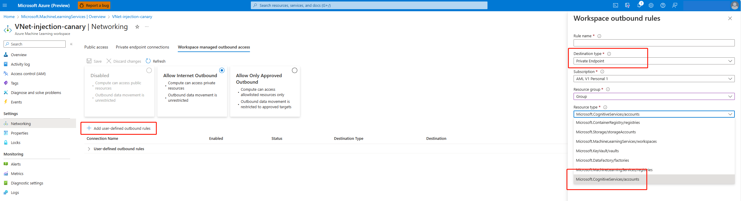 If you want to communicate with private Foundry Tools, you need to add related user-defined outbound rules to the related resource. The Azure Machine Learning workspace creates a private endpoint in the related resource with autoapproval. If the status is stuck in pending, go to the related resource to approve the private endpoint manually.