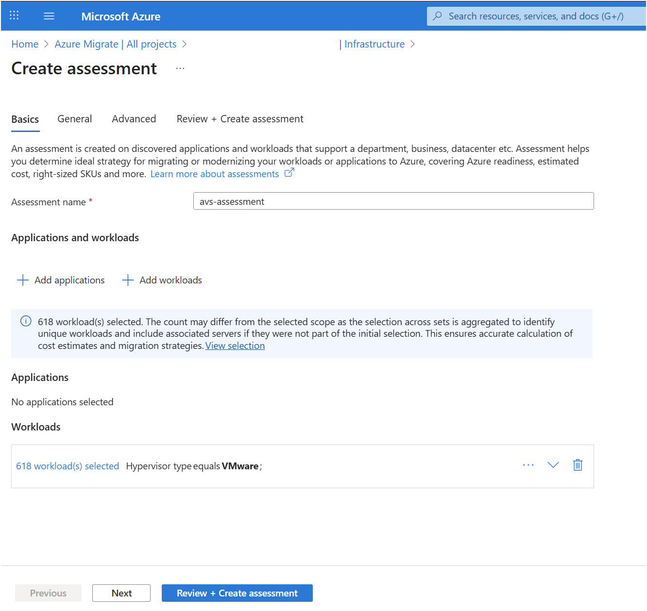 Provide Assessment name for the assessment. Click on Add workloads in case you need additional workloads for the assessment. Click on Next once the page is ready to proceed.