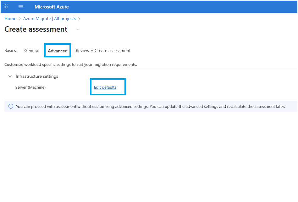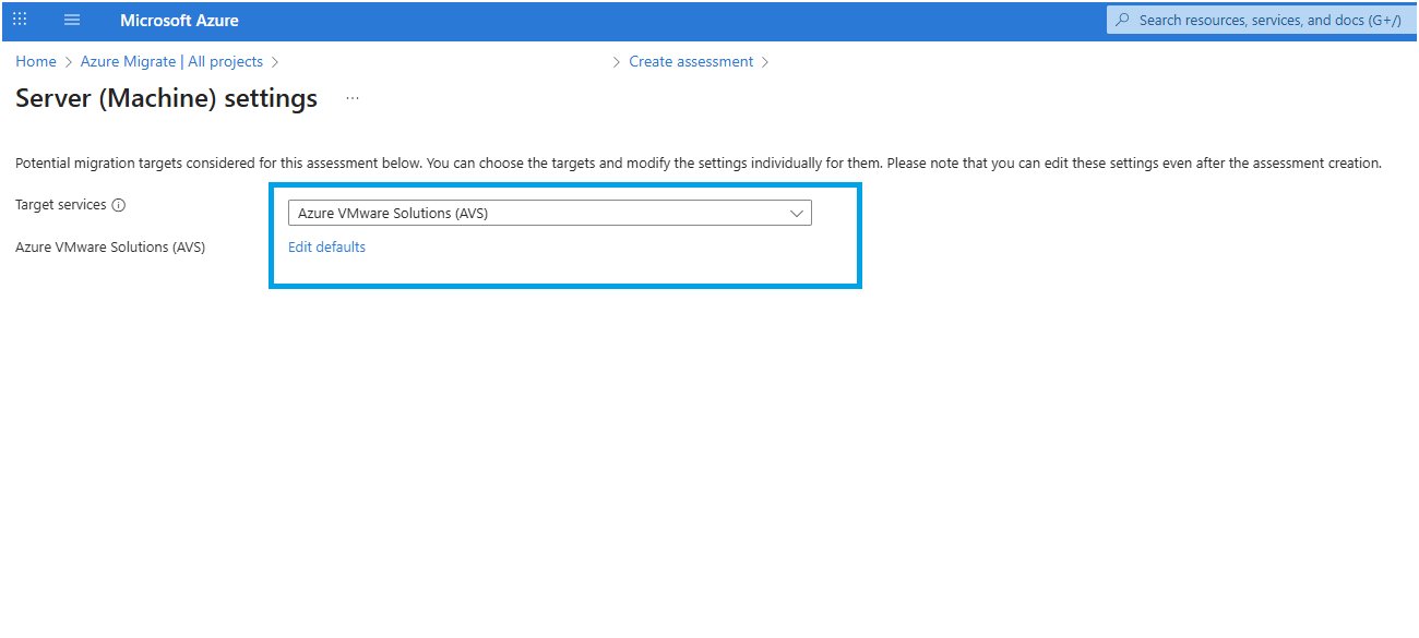 In Advanced settings, click on Edit defaults and ensure the Target services has "Azure VMware Solution (AVS)" and then click on Edit defaults: