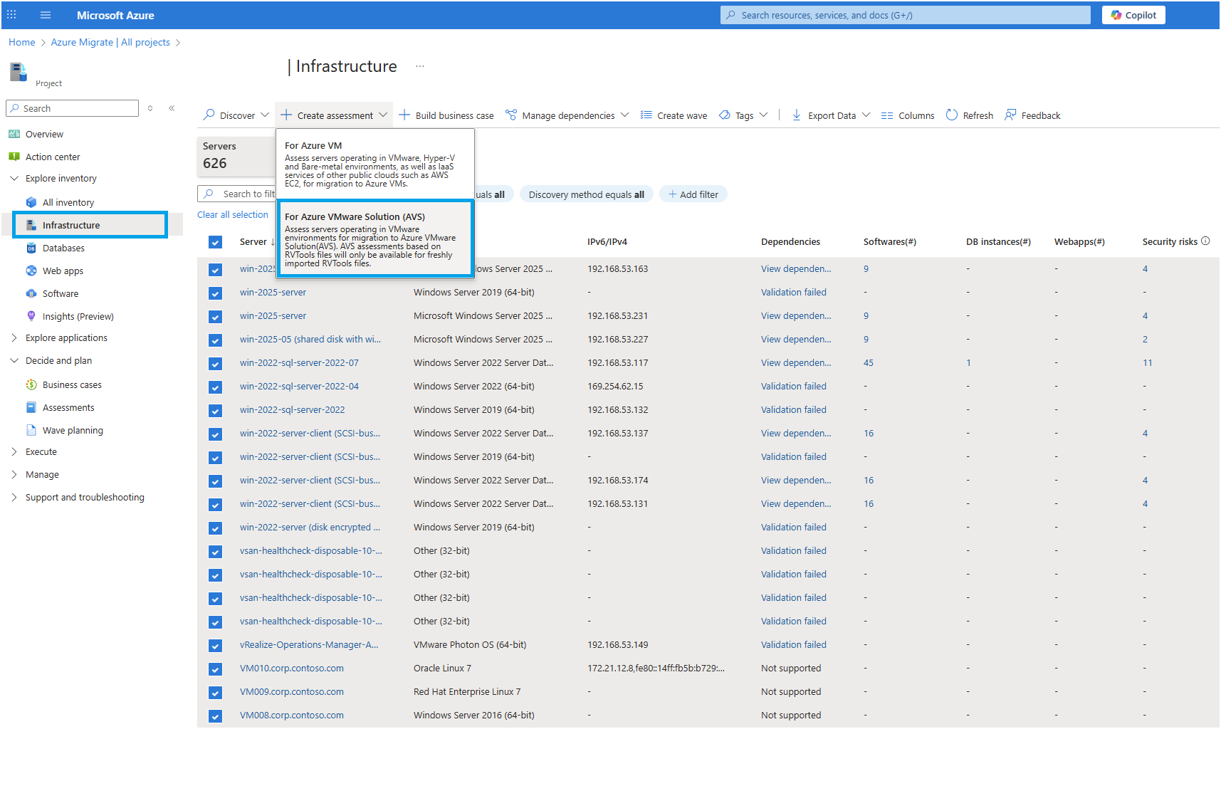 From the top menu, click on Create assessment drop-down, select For Azure VMware Solution (AVS).