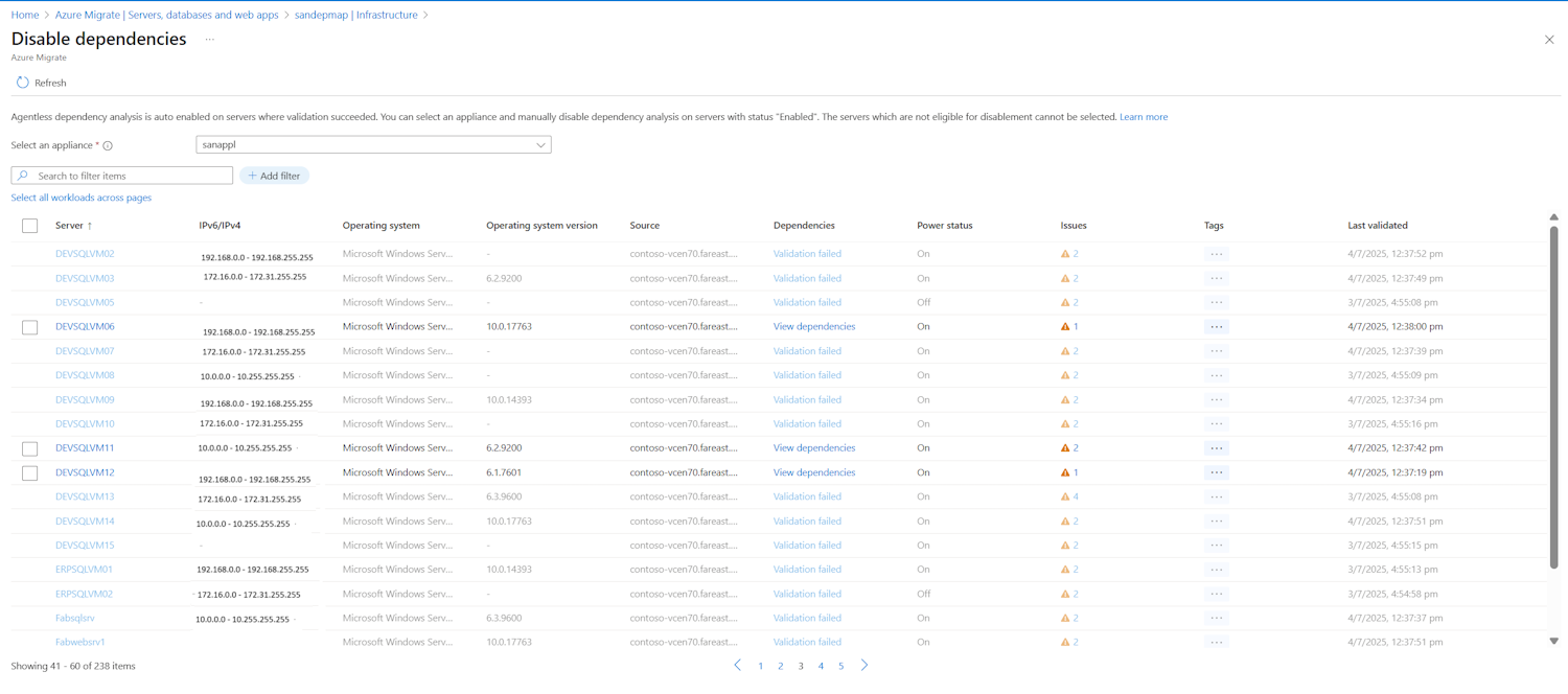 You can filter servers to disable dependency analysis on those that were autoenabled (servers with the status as Enabled). Servers that aren't eligible for disablement—such as those with the status Validation failed, Not initiated, Disabled, or Credentials not available'—can't be selected.