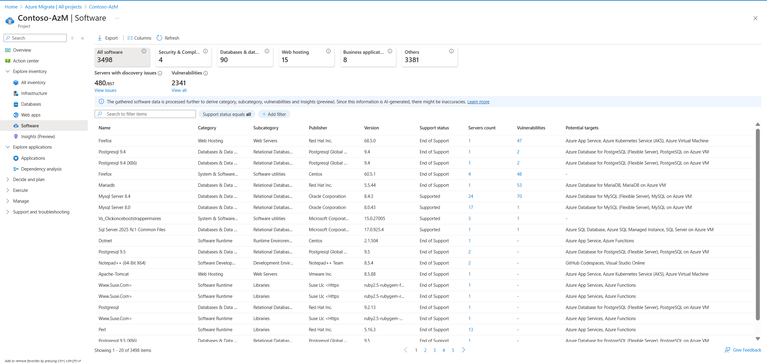 - Software inventory identifies Web hosting and Databases & Data platform workloads to plan the migration of your workloads to Azure